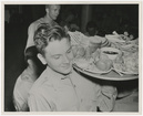 Cadet serving food in Mess HallClemson University LibrariesClemson cadet carrying a platter of food to serve in the old Mess Hall in Barracks No. 1. On back: [Mess Hall dining room]
