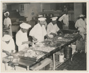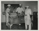 Mess hall kitchen staff serving cadetsClemson University LibrariesInterior shot of Mess Hell kitchen staff members serving cadets through one of the open-air windows separating the kitchen from the dining area. On back: [Mess Hall Kitchen with Cadets and Staff]