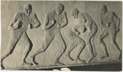 Cast stone bas-relief of "Cotton Bowl," circa 1940Clemson University LibrariesDepicts football players in action. Created to honor the Clemson Tigers' victory over the Boston College Eagles in the 1940 Cotton Bowl Classic game. Shown prior to installation in April 1941 over the entrance door to the Clemson College Field House (later known as Fike Recreation Center). On back - 5 and 1/2 feet by 11 feet 1940 Cast Stone Plaster Mould on other side.
