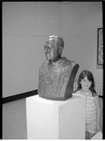 A. Wolfe Davidson's granddaughter Jennifer Burwinkle behind bronze bust of Gordon W. Blackwell in an exhibition, 1971