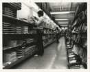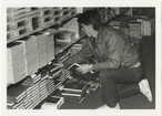Student shelving books at bookstore Clemson University Libraries On back: Bookstore [1980s] [01-87] P. 6 . 2