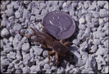 Mole cricket next to nickelClemson University Arthropod CollectionWritten on slide: Mole Cricket (Gryllotalpa hexadactyla); Chlordane or dieldrim