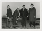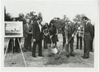 Lehotsky Hall groundbreakingClemson University LibrariesUA100_001485; On Back: [Jervey Athletic Center groundbreaking] [c1973] (foreground left to right): Dean of the College of Forest and Recreation Resources, William Henry Davis McGregor; Robin Hardin (student representative of the Recreation and Parks Department), President Edwards, and Chairman of the South Carolina Forestry Study Commission, R. Scott Wallinger  Note rendering on easel, which matches image no. 624.