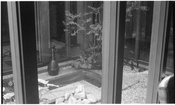 Glass enclosed area with plants, water, rocks and glazed ceramic lekythos style ...