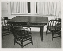 Dormitory study table and chairsClemson University LibrariesOn back: Littlejohn Collection Duplicate [ Barracks- Interior View] 166 40" x 53 1/2 - 30" high This is a blond oak finish table made especially for the College. Inventory 138 Good, 28 To be repaired, [total] 166