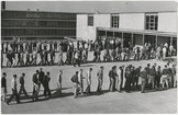 Students in line to enter Harcombe Dining HallClemson University LibrariesJohnstone Hall E in background ; On back: Dining Hall; [Johnstone Hall]; [Harcombe Dining Hall, exterior]; UA100_001145