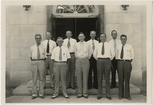 Building inspection committee for Sirrine Hall Clemson University Libraries On back: [Sirrine Hall]; Building Inspection Committee, New Textile Building, Clemson S.C. August 23, 1938. Front row, left to right: Mr. [illegible], P.W.A; J. E. Sirrine, President of J. E. Sirrine Company, Engineers and Architects; J. C. Littlejohn, Business Manager of Clemson College; C. E. Daniel, President Construction Company; and Ed. Moore, foreman for Daniel Construction Company.; Back row, left to right: B. A. Morgan, J. E. Sirrine Company; H. H. Willis, Dean of Clemson Textile School; L. W. Burdette, J. E. Sirrine Company; and George Morgan, J. E. Sirrine Co.