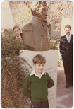 A. Wolfe Davidson's grandson Kevin McCulloch with bronze statue of Thomas Green Clemson on Clemson University campus, circa 1980