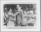 Photograph; 1900-1950 Golden Jubilee Anniversary, Orr Mills, Anderson, S.C., Wednesday, May 24, 1950; caption reads Sally Jones pins a golden rose on each of the men