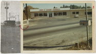 Composite image of Bob-E-Llene Fabrics building and sign for Busy Restaurant and Mini Plaza on Atlanta Highway in Gainesville, Georgia, 1969 Clemson University Libraries With hand-drawn red arrows showing the relation of a sign in one photograph to its position in the other. Building owned as rental property by A. Wolfe Davidson. On back - First post of "Mini Plaza" sign.