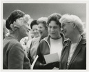 R. M. Cooper Library dedication stage partyClemson University LibrariesOn back: Dedication of R. M. Cooper Library Oct. 14, 1966; R. H. Yeargin, Building Contractor; Mrs. Cooper, James F. Byrnes, Melford Wilson behind him(left of Byrnes), James Oscar Wynn, Olin Foundation and; speaker; Dr. R. C. Edwards
