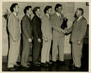 A.J. Schwantes shaking hands with S.T. Russell (holding trophy)with other Clemson students looking on Clemson University Libraries S.T. Russell shaking hands with A.J. Schwantes with other Clemson students from the American Society of Agricultural Engineers. On back of photograph: Representing Clemson college in receiving the annual Farm Equipment Institute award at Michigan State college on June 20, were the five Clemson students shown above. S.T. Russell of Jamestown, second from right, receives a trophy on behalf of the Clemson chapter from A.J. Schwantes, extreme right, head of the Agricultural Engineering department at the University of Minnesota, and president of the national group of the American Society of Agricultural Engineers. Clemson won the award as having the outstanding student group of ASAE in the colleges in the United States and Canada and was based on a 100-page summary of the activities of the Clemson chapter. Other Clemson men attending the national meeting in Michigan were, left to right, A.W. Snell of Elloree, J.P. Bull of Santee, L.G. Jeffords of Timmonsville and H.N. Black of Ruffin.
