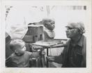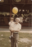 A. Wolfe Davidson (right) with grandson Kevin McCulloch holding yellow balloon in front of carousel