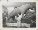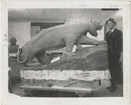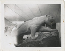 A. Wolfe Davidson with clay model for his "Brotherhood of the Tiger" statue next to tiger in cage at Grant Park Zoo in Atlanta, Georgia, 1966 December Clemson University Libraries Ink lines drawn over tiger. Clay model is preliminary for A. Wolfe Davidson's "Brotherhood of the Tiger" aluminum statue commissioned by Tiger Brotherhood and installed in front of Clemson University's Littlejohn Coliseum in 1969.