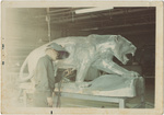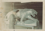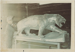 A. Wolfe Davidson with clay model for "Brotherhood of the Tiger" statue, 1967 April 28 Clemson University Libraries Model is preliminary for A. Wolfe Davidson's "Brotherhood of the Tiger" aluminum statue commissioned by Tiger Brotherhood and installed in front of Clemson University's Littlejohn Coliseum in 1969.