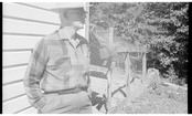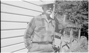 Man in hat, plaid shirt and glasses smoking a pipe outside near a wire enclosed pen